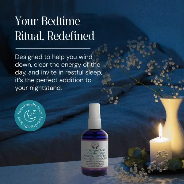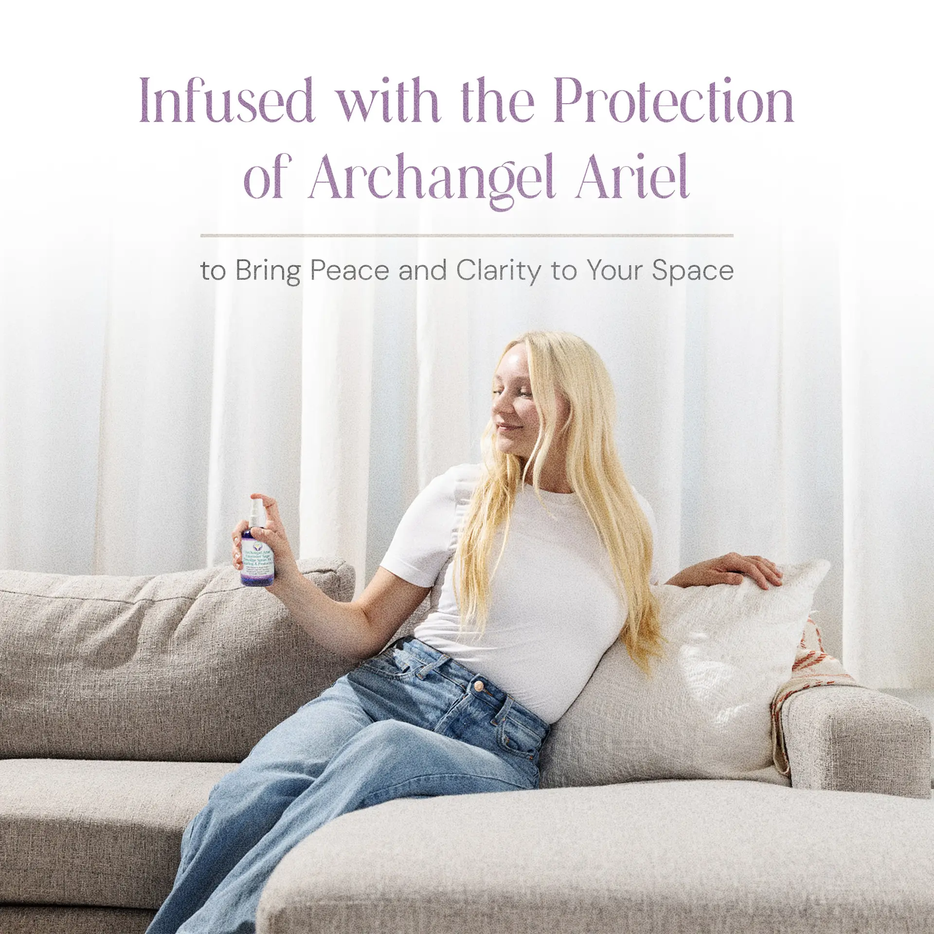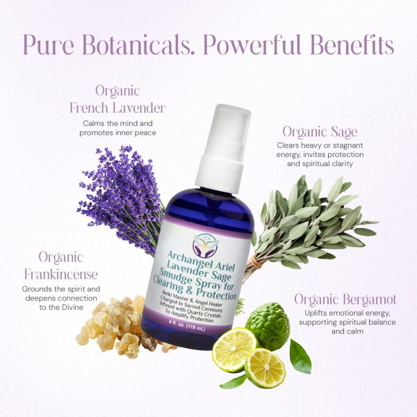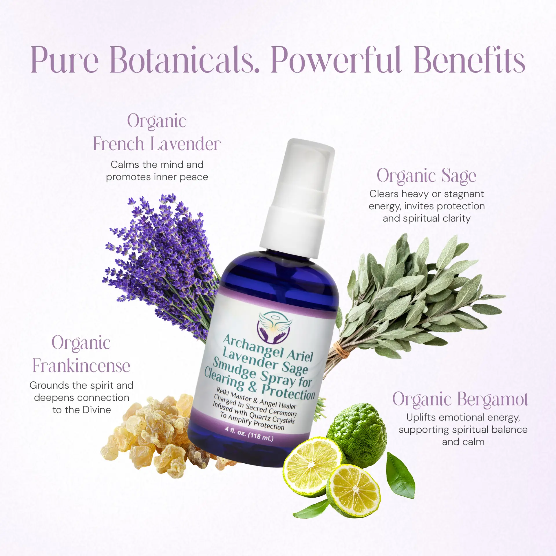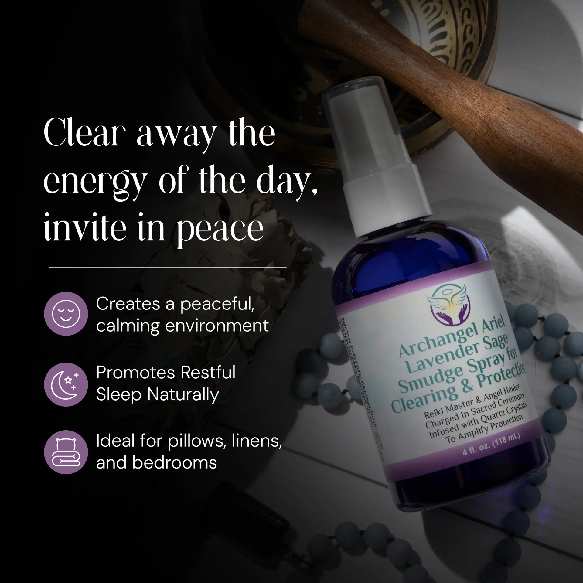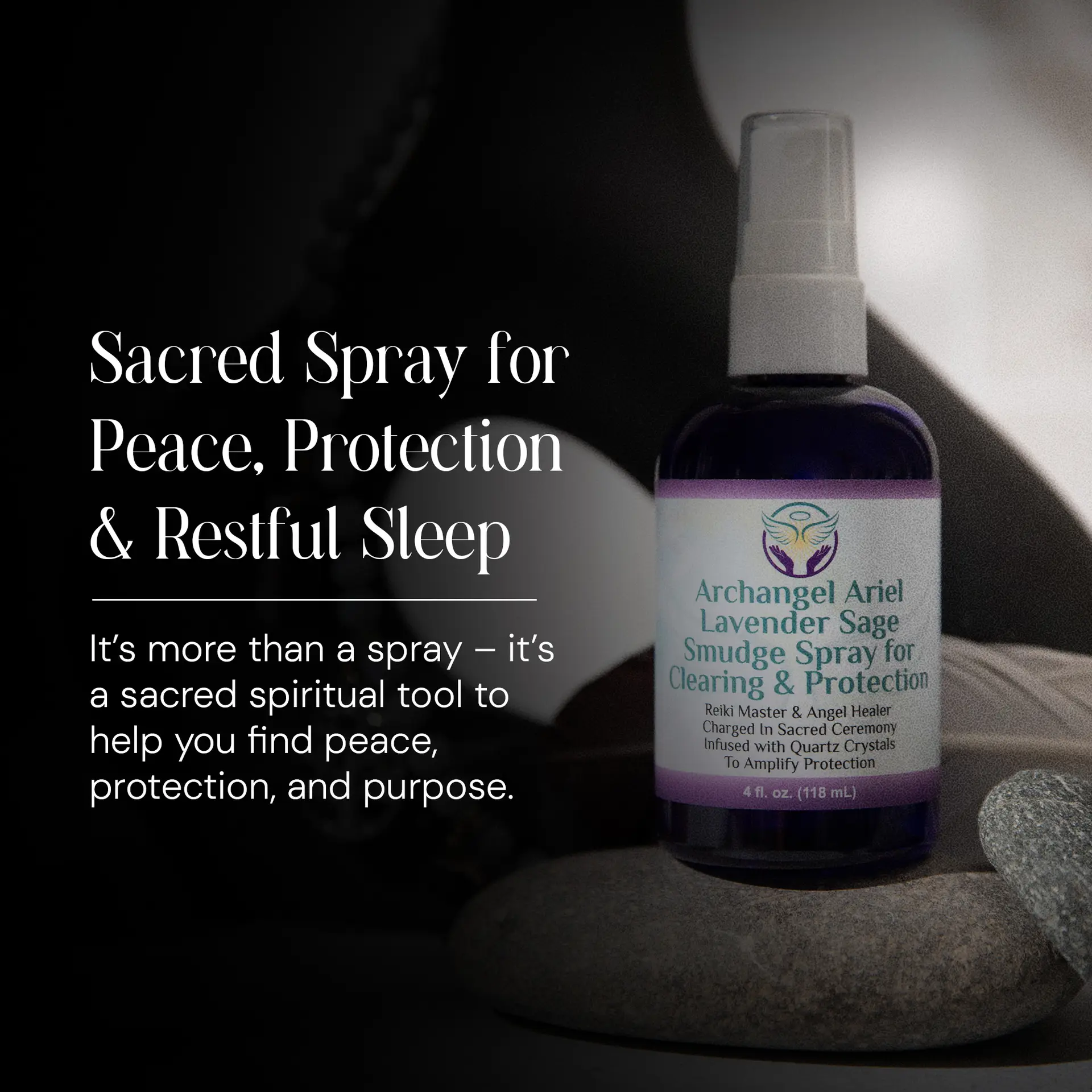 Blending the intention of a traditional lavender sage smudge spray with the softness of a bedtime mist, this handcrafted cleansing spray helps clear negative energy, uplift your spirit, and ease your transition into rest. Reiki-charged and blessed in ceremony by Angel Healer Tom, each 4 oz bottle carries the loving guidance of Archangel Ariel—angel of protection, purpose, and courage. Lightweight and travel-ready, take your ritual anywhere.