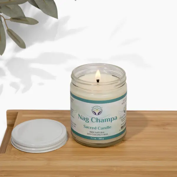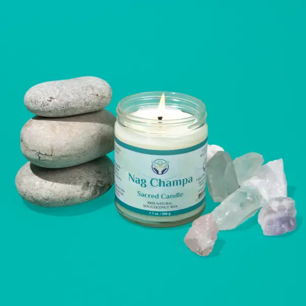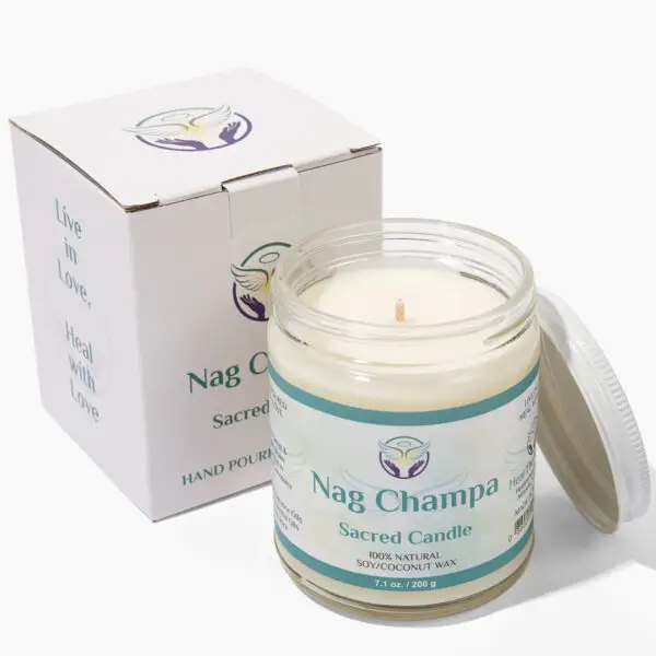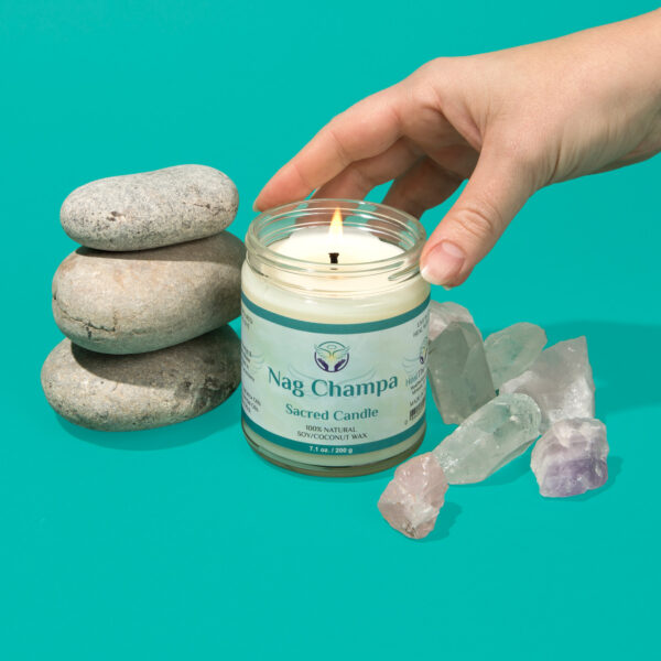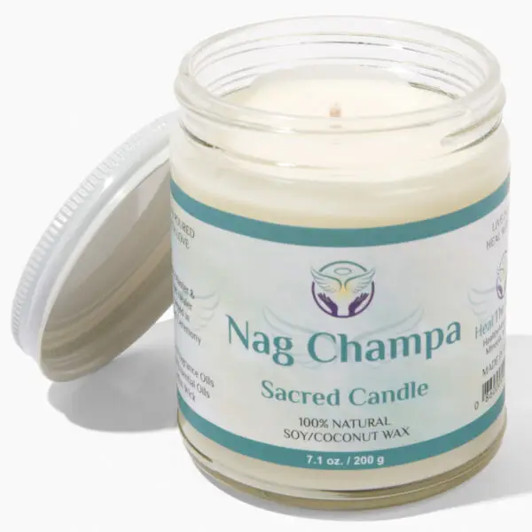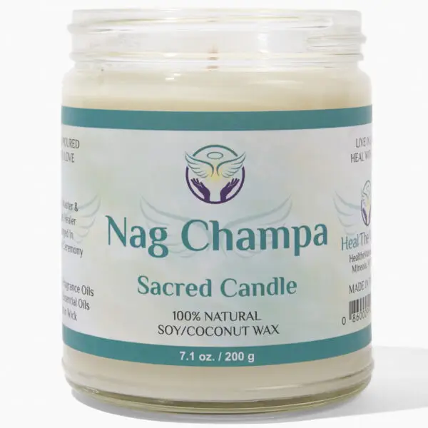 Nag Champa Sacred Smudge Candle – Hand poured candle made with an all natural soy/coconut blend wax, cotton wick, premium fragrance oils, essential oils and Organic Frankincense. The candle is made with love and charged by a Reiki Master and Angel Healer in a sacred ceremony.